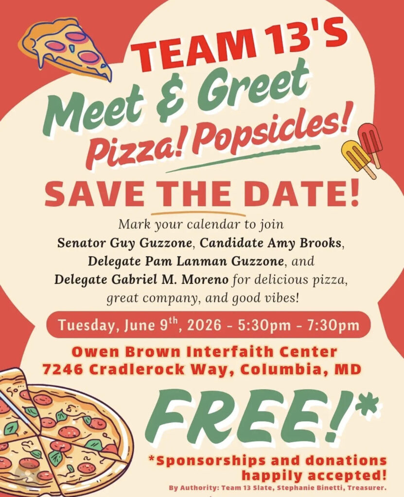 Mark your calendar to join Senator Guy Guzzone, Candidate Amy Brooks, Delegate Pam Lanman Guzzone, and Delegate Gabriel M. Moreno for delicious pizza, popsicles, great company and good vibes.